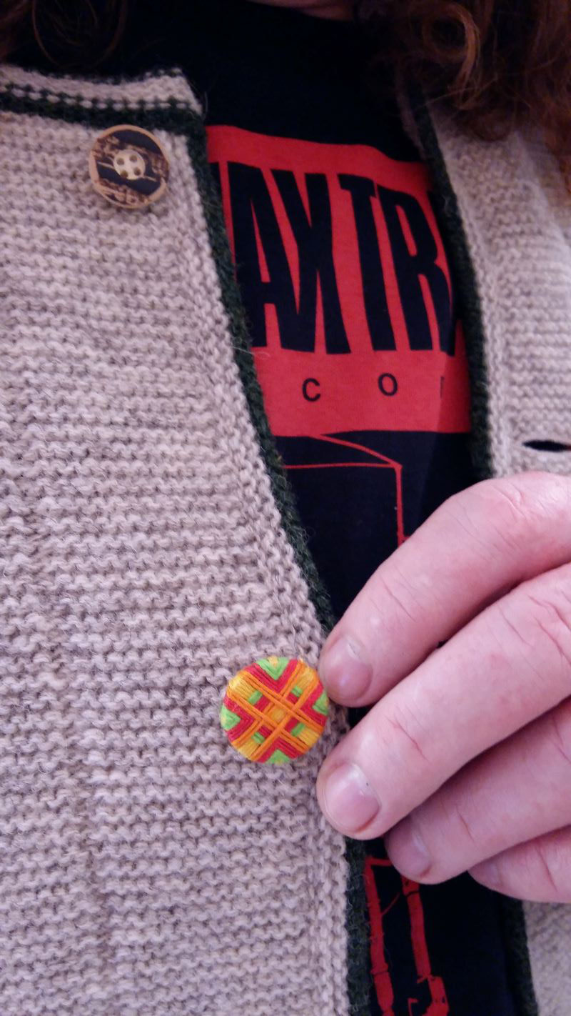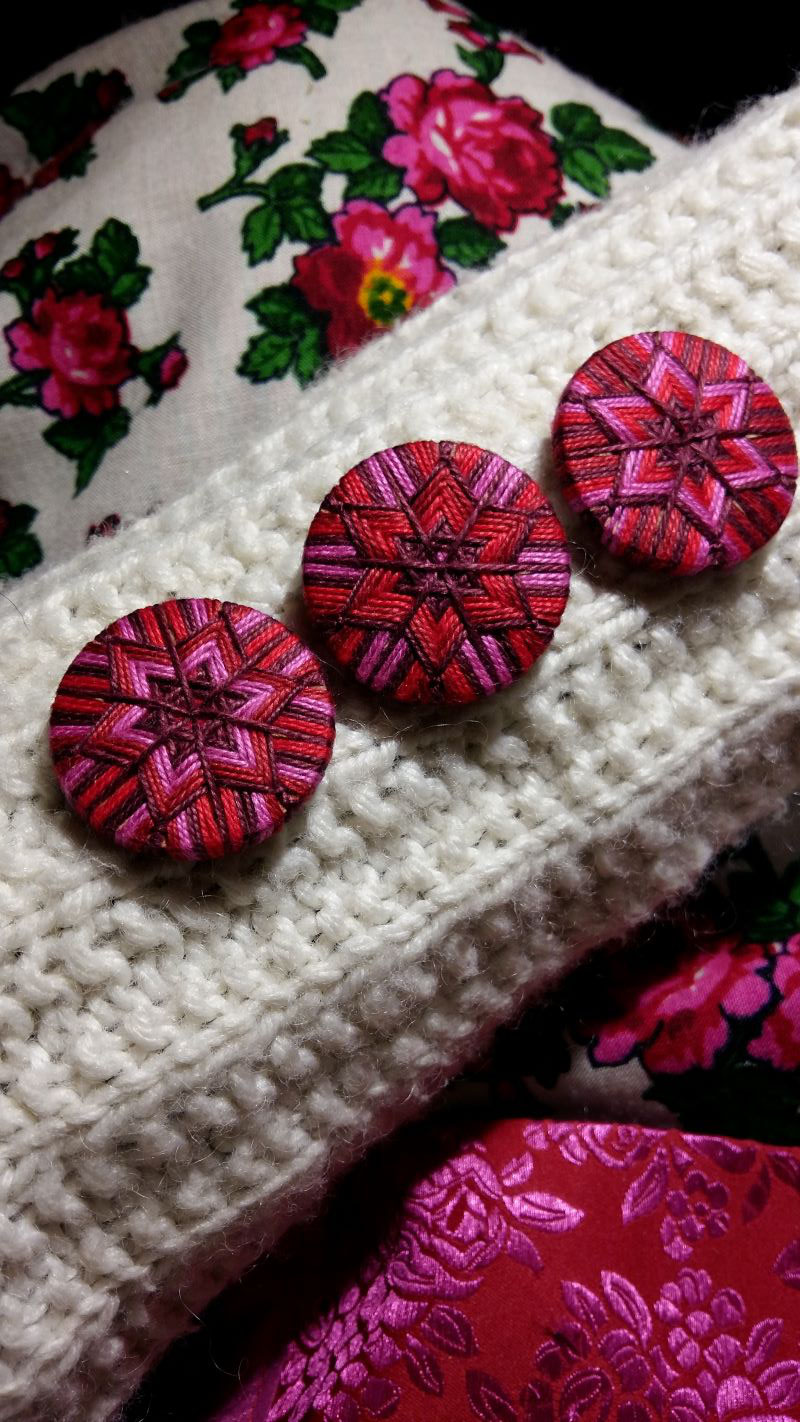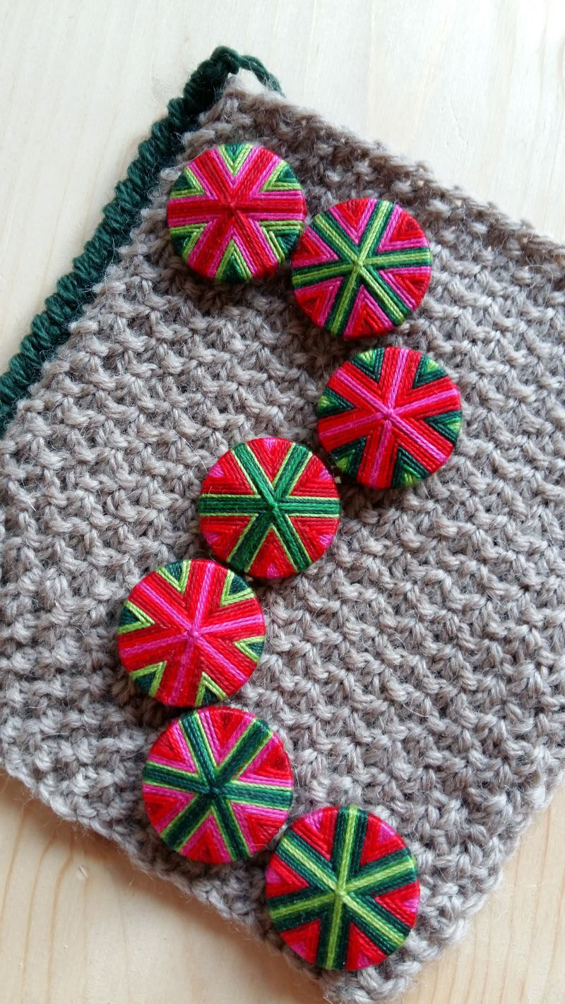 Üblicherweise werden unsere Knöpfe auf flachen Scheiben, bzw. Ringen gearbeitet, einige Muster sind jedoch auch als gewölbte Knöpfe umsetzbar, sie sind mit einem „K“ für „Kuppel“ gekennzeichnet. Die Knöpfe bieten wir regulär in verschiedenen Größen von 14 bis 40 mm Durchmesser an. Genauere Größen-Angaben erfährst du auf Anfrage. Flache Knöpfe sind ca. 4-8 mm hoch, Kuppel-Knöpfe ca. 10-14 mm. Angenäht werden sie klassischerweise an den Fäden der Knopf-Unterseite.