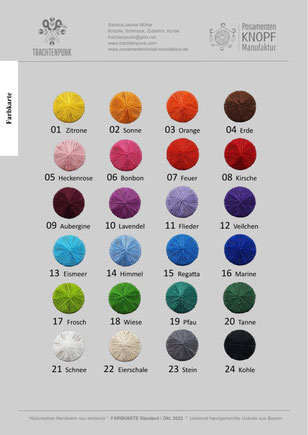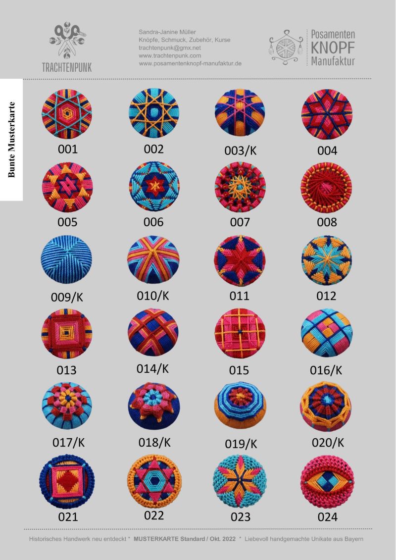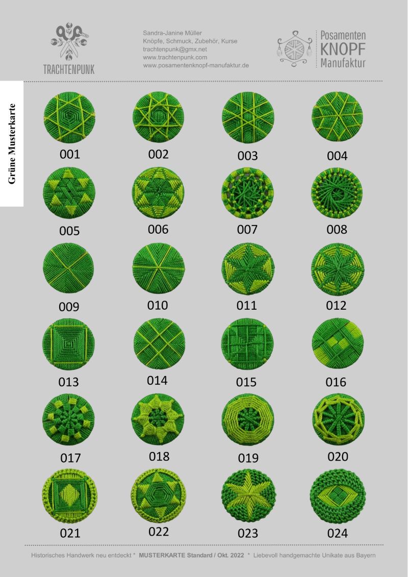 Es gibt unzählige Knopfdesigns, sowohl historische als auch von uns selbst entwickelte. Wir haben aus einer Vielzahl unterschiedlicher Posamentenknopf-Arten die schönsten 24 für unsere Standard-Musterkarte zusammengestellt. Die haben wir in einer grünen und in einer bunten Variante angelegt - um einen Eindruck davon zu vermitteln, was die Farbwahl für einen Unterschied macht.